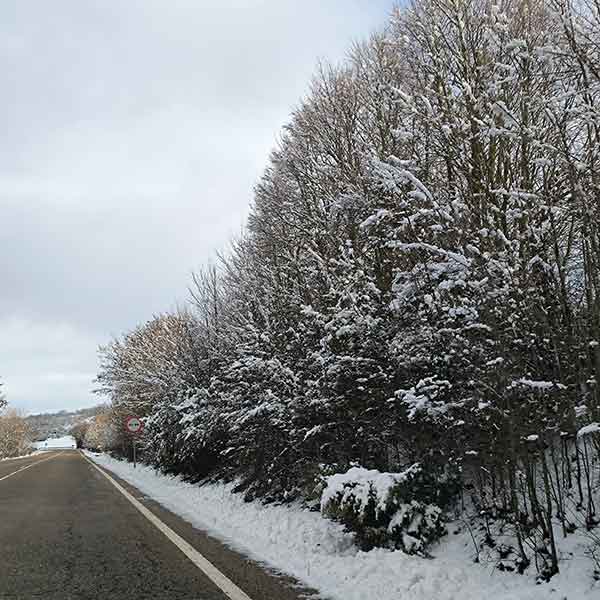 Como aún quedaba luz, decidimos seguir por Bujarrabal, y tras deambular entre sus casas y sentarnos un rato en el helado porche de la iglesia, nos internamos por carreteras secundarias y más grosor de nieve, cruzando el bosque de robles, mágico y misterioso con sus líquenes, sus hojas secas y la blancura persistente, con sus rocas dolménicas casi ocultas, algún corzo cruzándose y parando después, para mirar curioso ese vehículo-tortuga que se desplazaba lentamente en medio de un desierto incoloro, sin sonido, salvo el de la propia nieve desplomándose de las ramas.